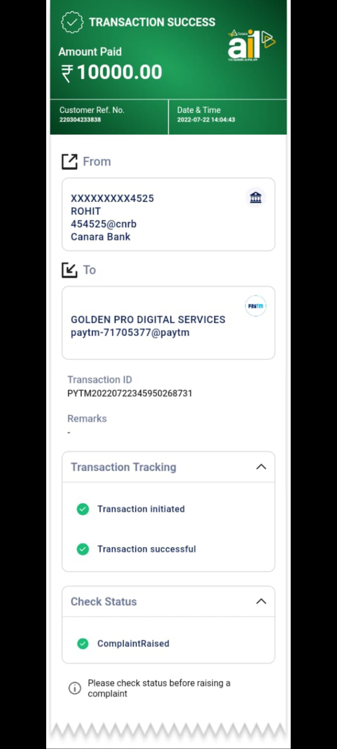 सर मेरे द्वारा 10000 rs से रिचार्ज किया गया था ऑनलाइन गेम में लेकिन अभी तक मेरी गेम एप्लीकेशन में रुपए एड नहीं किए गए जिसका utr नंबर मेरे पास है। बैंक से बात की तो बैंक ने कहा की पेमेंट सक्सेस हो गया लेकिन गेम ने वॉलेट में नहीं डाला।