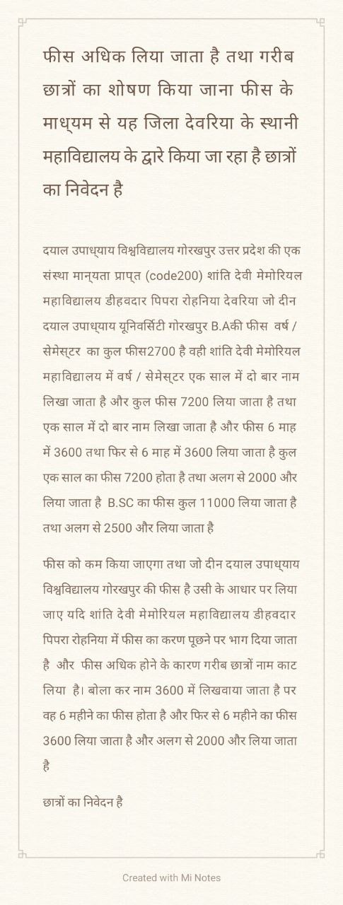 फीस को कम किया जाएगा तथा जो दीन दयाल उपाध्याय विश्वविद्यालय गोरखपुर की फीस है उसी के आधार पर लिया जाए यदि शांति देवी मेमोरियल महाविद्यालय डीहवदार पिपरा रोहनिया में फीस का करण पूछने पर भाग दिया जाता है और फीस अधिक होने के कारण गरीब छात्रों नाम काट लिया है। बोला कर नाम 3600 में लिखवाया जाता है पर वह 6 महीने का फीस होता है और फिर से 6 महीने का फीस 3600 लिया जाता है और अलग से 2000 और लिया जाता है