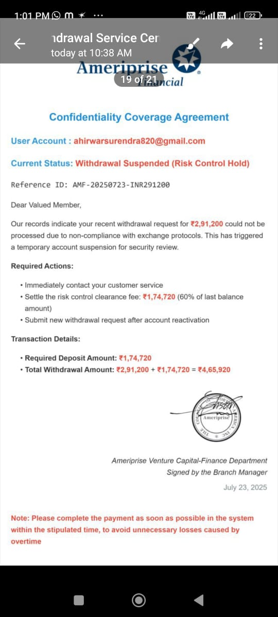 | Name(s) of companies complained against | Ameriprise Financial, Company Name: Ameriprise Financial Address: plot 14, Gurugram, Haryana 122015, India https://www.ameriprise.com, Sarhol, sector 18, UDYOG VIHAR |