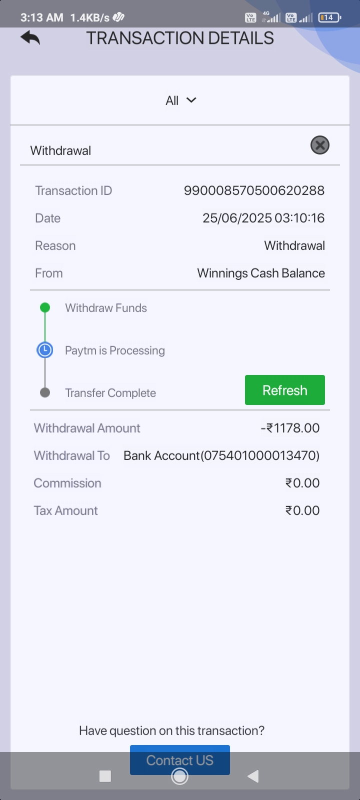 ரோஸ் ரம்மியில் அட்டை விளையாடி வென்ற தொகை வங்கியில் திரும்ப பெறுதல் செய்தேன் தேதி 25-06-2025 அன்று நேரம் 3;10 விளையாட்டின் திரும்ப பெறுதல் எண் ஆடர் எண்; 990008570500620288 என்பது திரும்ப பெறுதல் எண் ஆகும் ஆனால் இன்னும் எனது வங்கிக்கு வென்ற பணம் அல்லது பரிசு🎁 தொகை வங்கி கணக்குக்கு வரவில்லை இதனால் மிகுந்த மனவுளைச்சல்லுக்கு ஆலசனேற்றம் ஆகையால் எனது தொகையை பெற்று தரவும் மிக தாழ்மையுடன் கேட்டுக்கொள்கிறேன்.