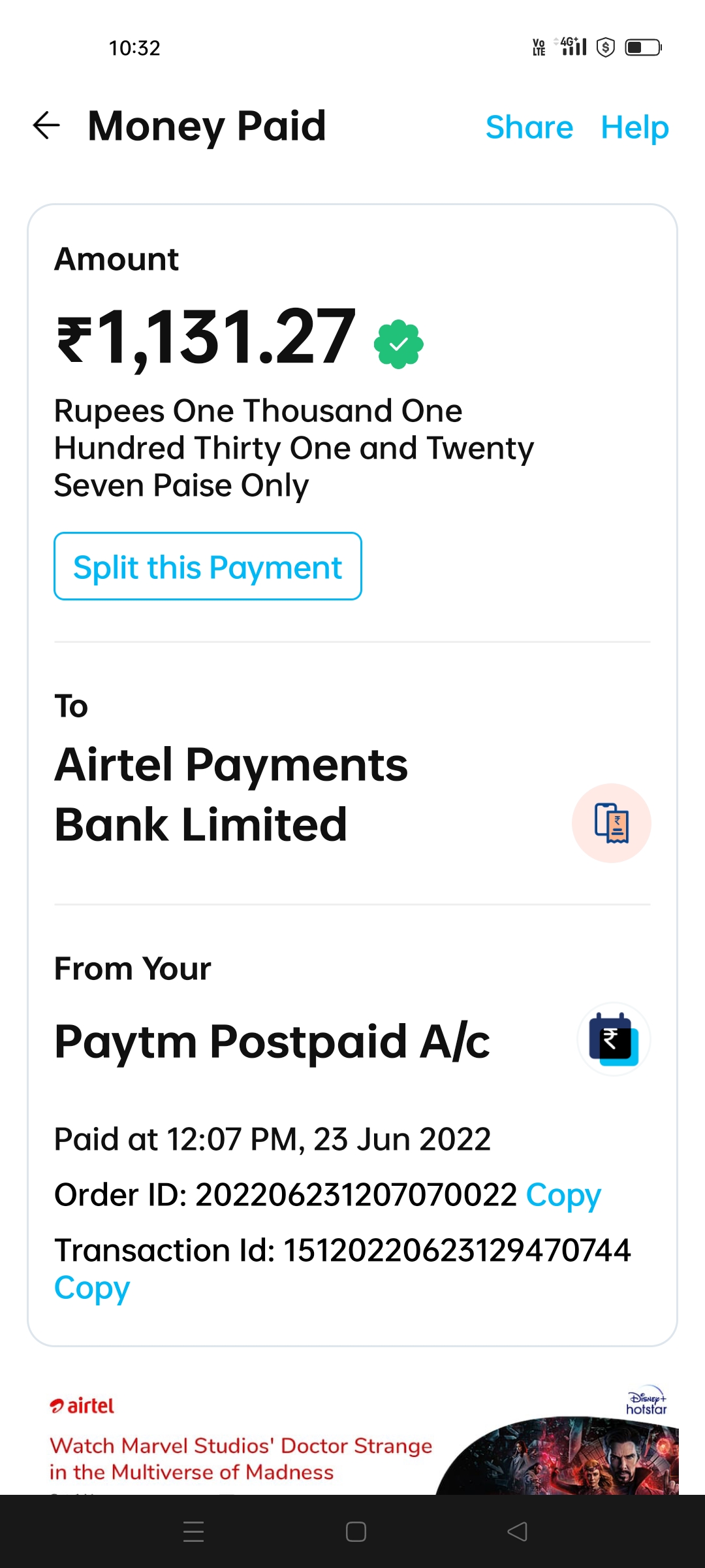 On 23rd June 2022, I have paid my Airtel Black Plan Bill of Rs 1131.27 via Paytm Postpaid, the amount got deducted however not received by Airtel Payments Bank Limited, my payment got stuck between and amount deducted from my account. No one is helping, continuously following the customer care through calls and emails not getting any revert except we have not received your payment from Airtel and no customer care service from Paytm postpaid.