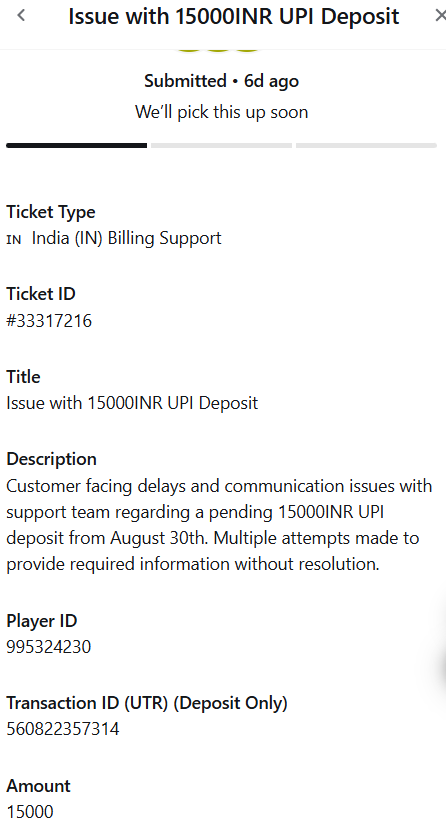 I made deposit of 15000INR on 30th Aug and logged ticket: #33435749 in Parimatch. Everyday i am following up via E-mail and Chat, Providing Bank Statement each and Every day. There Agents are giving random responses like it will resolve within 24 hours or resolve soon, Experts are working etc etc but even after 14 days, nothing is happening. Chat agent quite the conversation whenever they want without any reasonable updates.