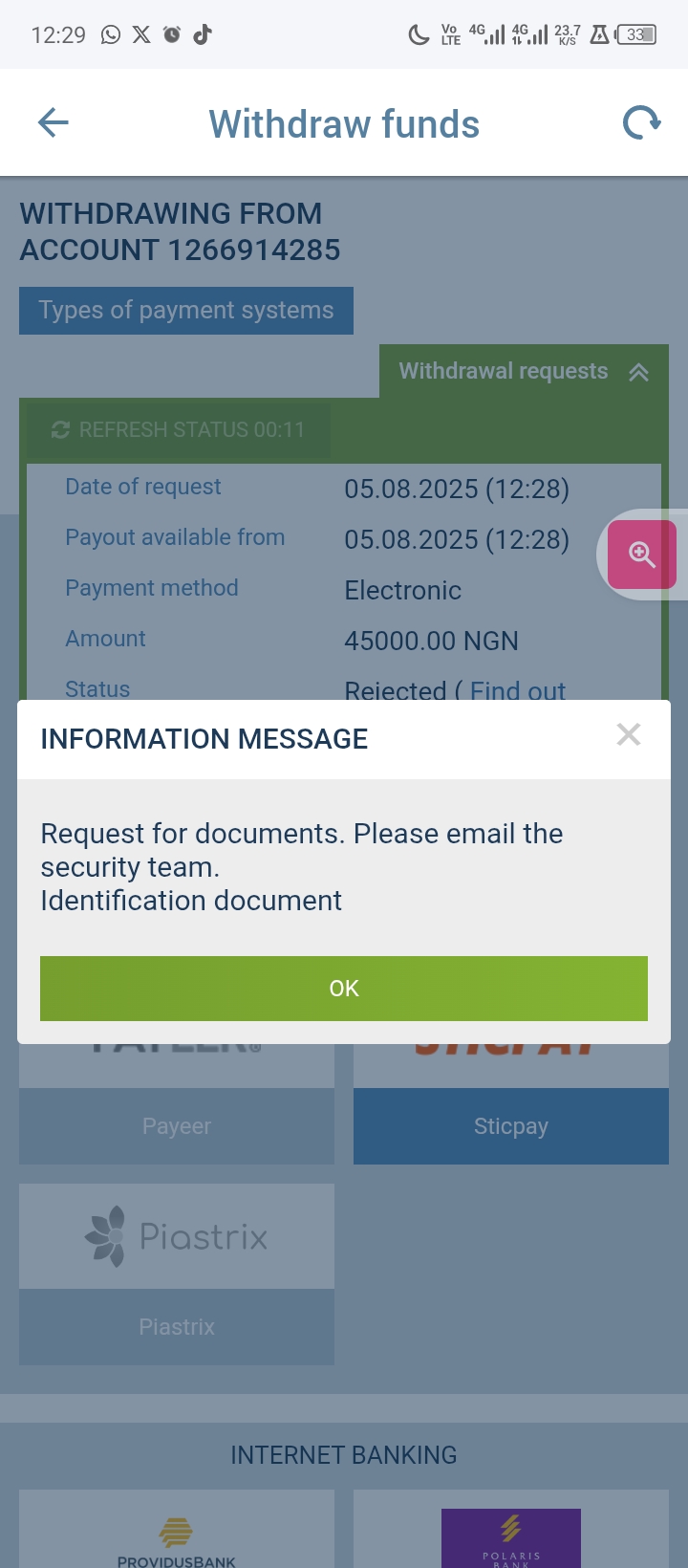 I want to Make withdrawal in my 1xbet account I was asked too submit my identification documents too security department and I did over 4 days no replies nothing nothing I’m stranded over 154k in my 1xbet