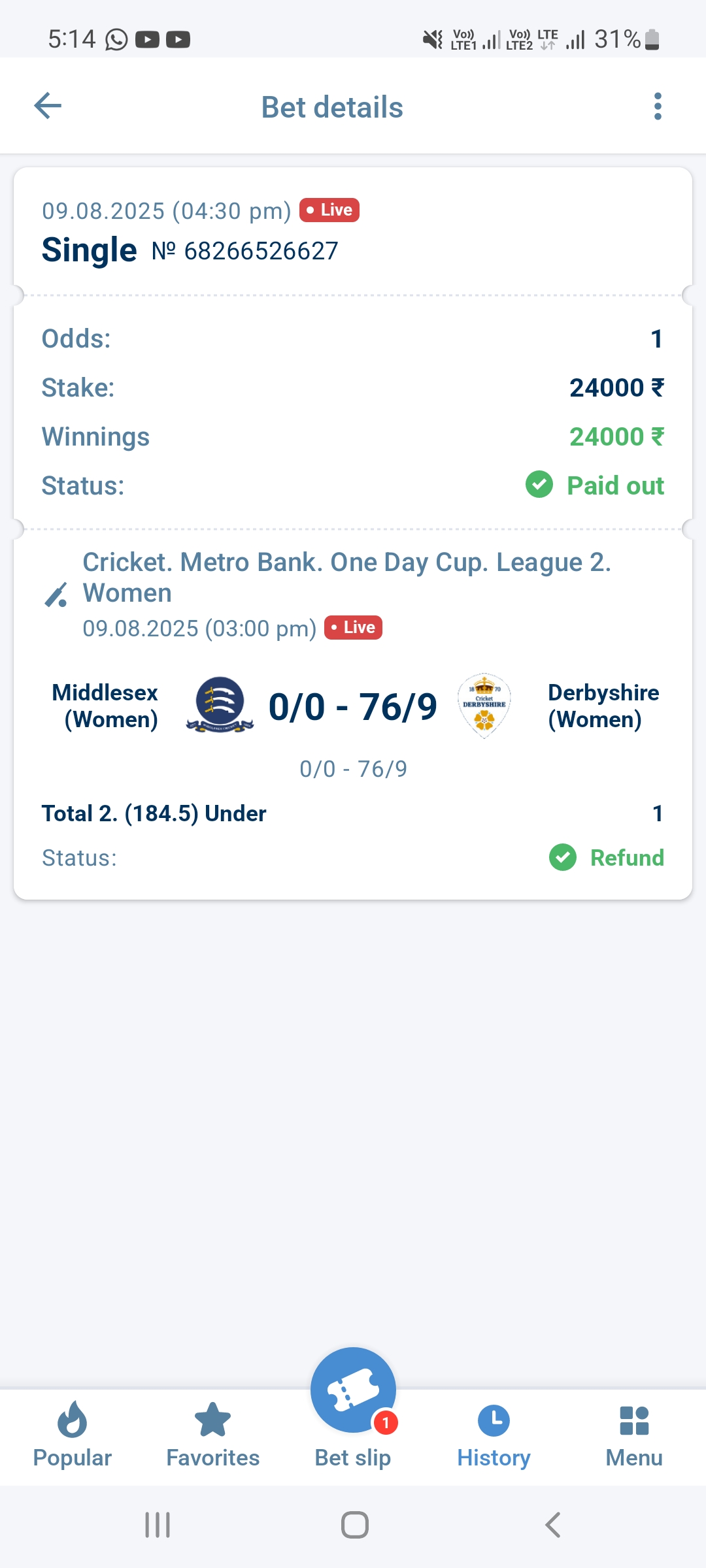 sir aaj 9 August ko Maine women metro one day cup league 2 match chal rha tha team 1 middlesex women vs team 2 derbyshire women sir team 2 batting Kar rhi thi or Maine 25 over me run 52.5 over par 10000 rupye bet slip lga diya or me ye bet har gya tha