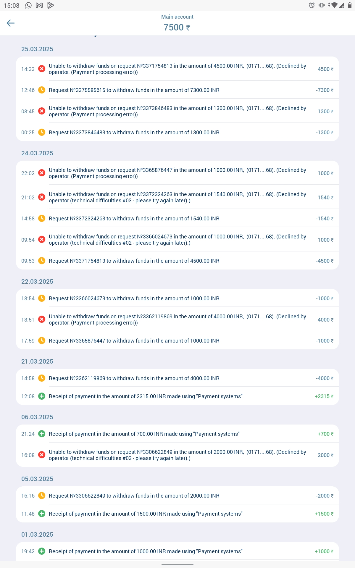 THE LATEST WITHDRAWAL WHICH I PLACED WAS ON 25/3/2025OF 7300 ON 12:16 BUT STILL NOT RECEIVED AMOUNT IN MY BANK ACCOUNT.