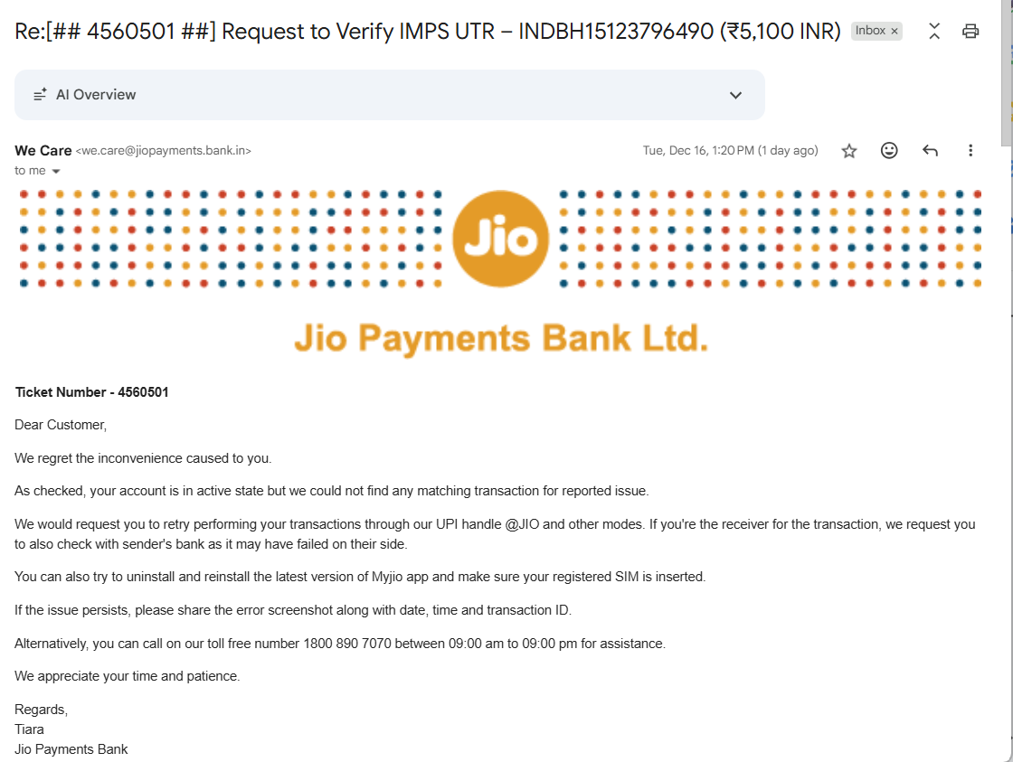 My bank (Jio Payments Bank) has provided written confirmation that no such IMPS transaction exists