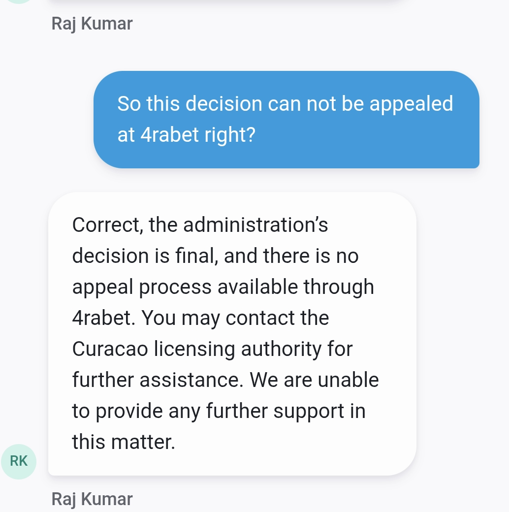 I have opened 4rabet account by mail id shivanipatel3233@gmail.com on 11th feb 2026. Deposited 19760 and Turn it into 43760 by playing live casino. But when I opted for withdrawal they ask verification. I completed that also. In next 10 hours when I opened account they said its blocked by administration in support chat, support@4rabet.com and help@4rabet21.com. Their support agent chat name(Rajkumar) and Ankur and others are so rude that we can not do anything regarding this, and told me to complain on complaints@cga.cw who provided 4rabet licence. So they dont fear anyone just open loot for people. When you loose they dont have any problem but if you win than they block your account. So please help me as their support team is total nonsupportive. Thanx. Attached screenshots
