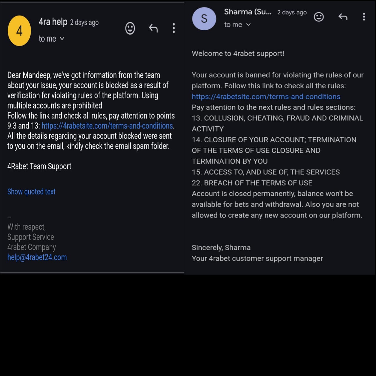 I had created my account on 4rabet and add money to wallet and when I tried to withdraw my winning they told me to verify my account. I submitted my documents for verification and then I verify my account with adhar otp and my account got successfully verified. After few minutes my account got blocked and when I asked reason from support team firstly they told me that my document is incorrect. Than I made complaint to 4rabet support at support@4rabet.com and help@4rabet24.com. Now they are saying that I had made multiple accounts and my money will not given me back. They had given two different excuses at two different times to block my account and fraud my money. If i had made multiple accounts then why they had given me my first withdrawal and blocked my account on second withdrawal. The real reason is that they want to scam my money. I already made earlier three complaint to consumer complaints court but didn’t receive any solution. I will continue to make complaint untill I didn’t receive my money. My registered email:- neetresult.nta.in@gmail.com