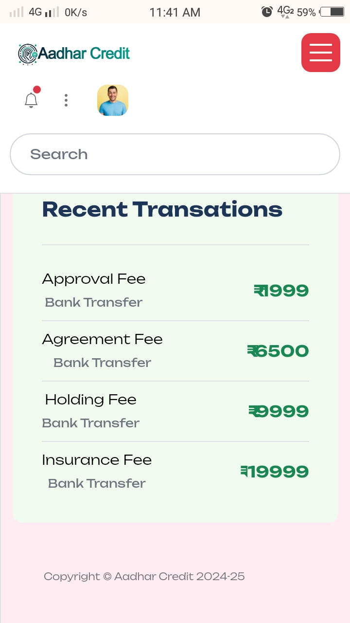Froud company. Aadhar credit finance company provides online loan. I applied 12th August for 5L for medical expenses . First pay prosassing fee 1999.then agreement fee 6555.then holding fee 9999 then company manager NIPUN RAWAT call me and said when u payment insurance charge 19999 ur loan provide. I pay this amount. But loan amount not credit my account. Company phone number off, what’s up off website not 0pen.