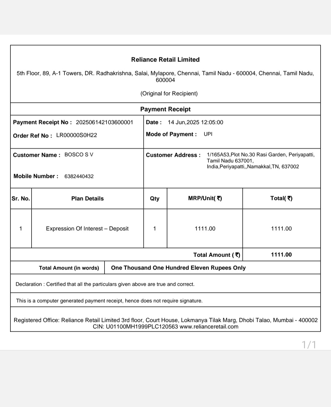 I have applied for a New jio fiber connection on 14.06.2025 via My jio App and paid Rs.1111.00 . Till date not got a single message or Call. Being much unlike with their service. I tried cancelling the booking in Myjio App. But no option is there and tried to call customer care. The recorded voice of customer care is telling the installation will be scheduled. No other option to talk to an executive. Or cancel the booking online. I tried the email option and sent an email requesting to cancel my booking refund the amount. I got a reply that, I have to contact via online website or my jio app. Again I tried in my jio app and No use in it as there is no option for it. kindly refund the money Back to me.
