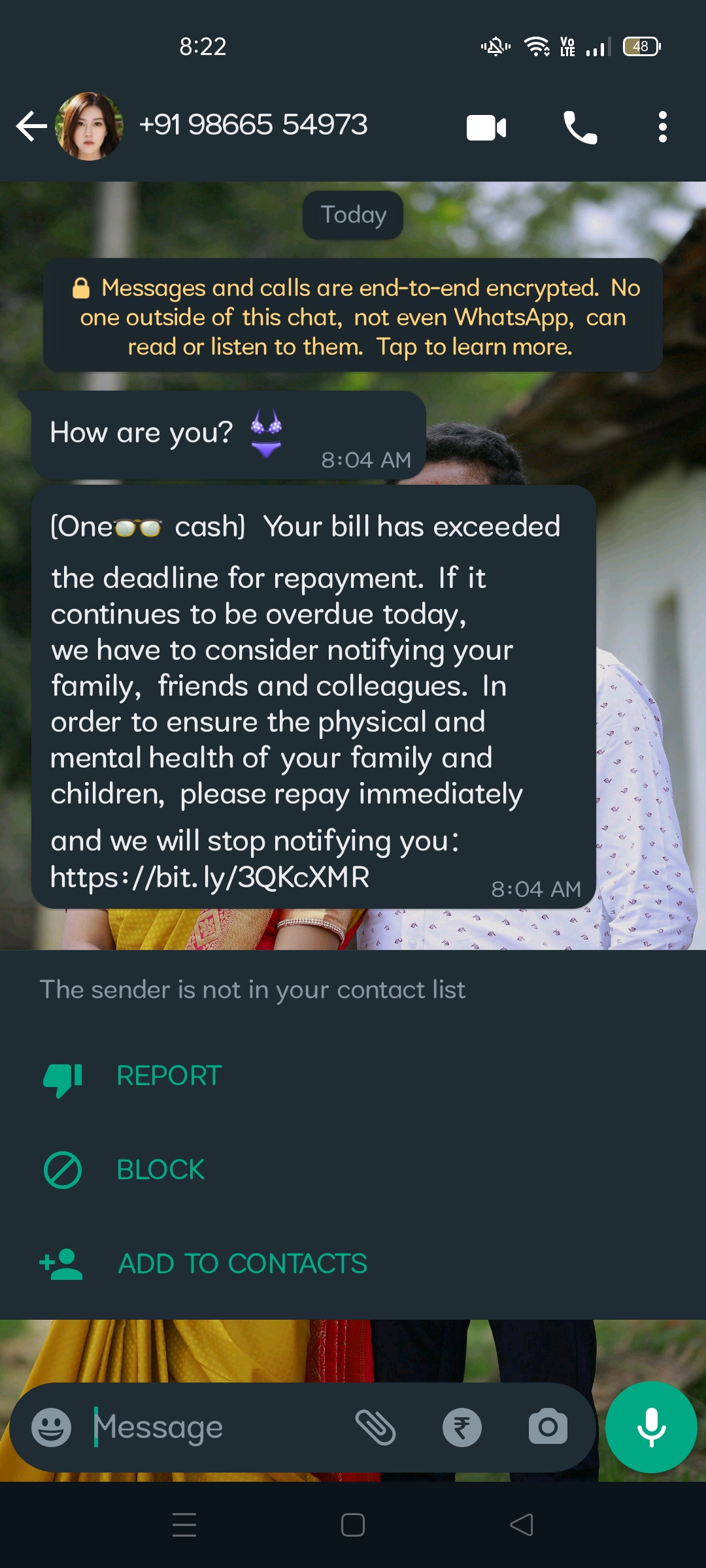 Sending fraud messages in watsapp like this [One? cash] Your bill has exceeded the deadline for repayment. If it continues to be overdue today, we have to consider notifying your family, friends and colleagues. In order to ensure the physical and mental health of your family and children, please repay immediately and we will stop notifying you:https://bit.ly/3QKcXMR so tell them to stop sending messages to my WhatsApp