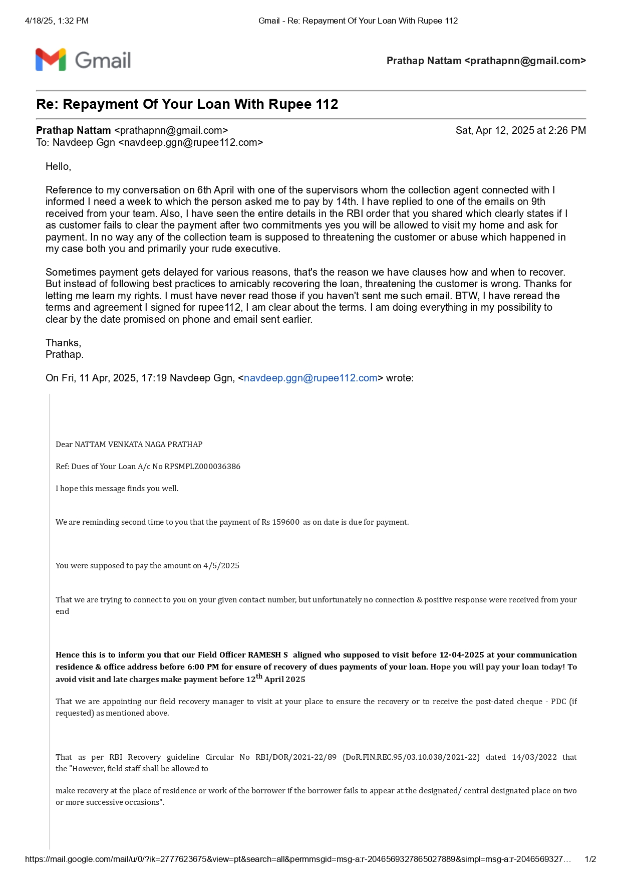 I have taken a payday loan from Rupee112(https://www.rupee112.com). I paid few loans that were availed and this month the payment was delayed due to unforeseen personal challenges. I informed the collection team member even before the due date that the payment will be delayed, yet the person was very persuasive and rude mentioning “I don’t know, you have to clear” and eventually they sent many threatening messages on WhatsApp and even called my company HR by accessing my phone contacts without my consent that is completely privacy concern for me. They were using profane language on WhatsApp calls to avoid phone call recording because on couple of phone calls when they were rude and used bad words, I recorded that conversation. I understand I agreed to the 1% daily interest of the loan amount but this kind of agony is not acceptable. They have no right to illtreat me not following RBI governed rules and the RBI defined fair practices. Please look into this issue. All these mental torture for 10 days delay from the due date and the unfair practices started just a day before due date.