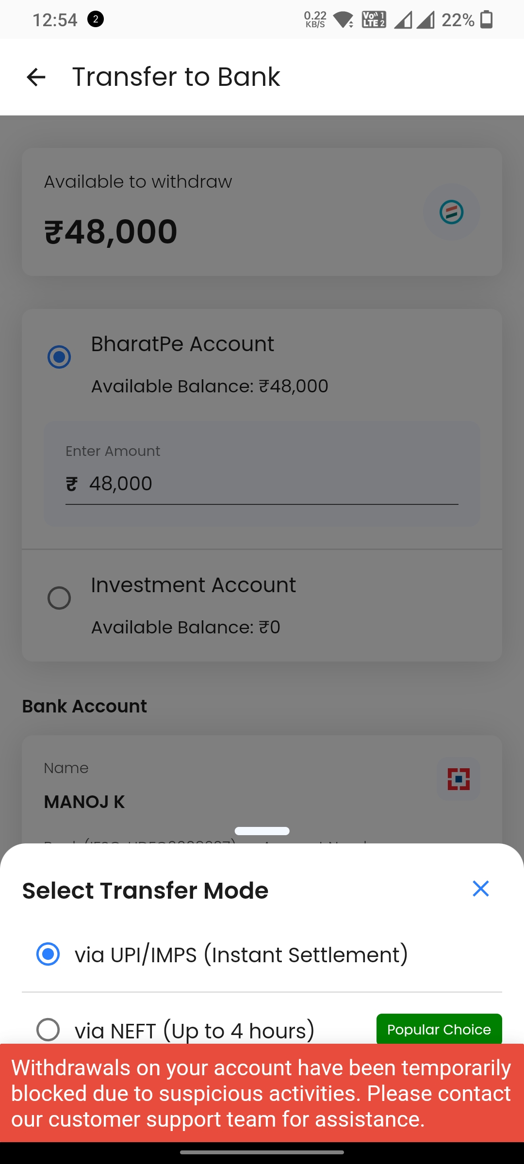 My bharathpe account for settlement has been blocked if contacted customer and they are not giving proper resolution i have provided all the documents for unblock but they are not even bothered to unblock they are holding my money of rs 48000 and playing games by saying will update shortly so please help us we are common people who work hard for 1 time food