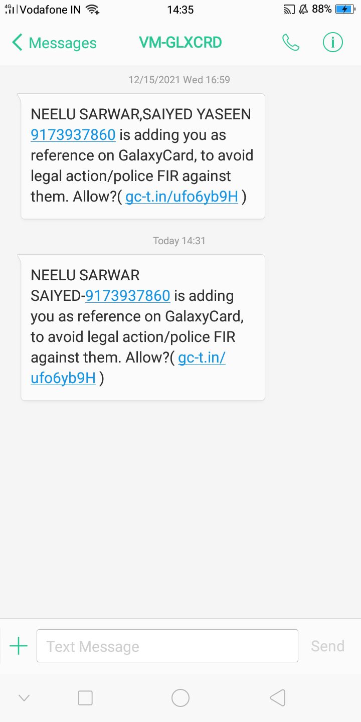 I keep getting the attached SMS quiet often. Who is the person? I have not given anyone permission to add me as reference. Please take necessary action.