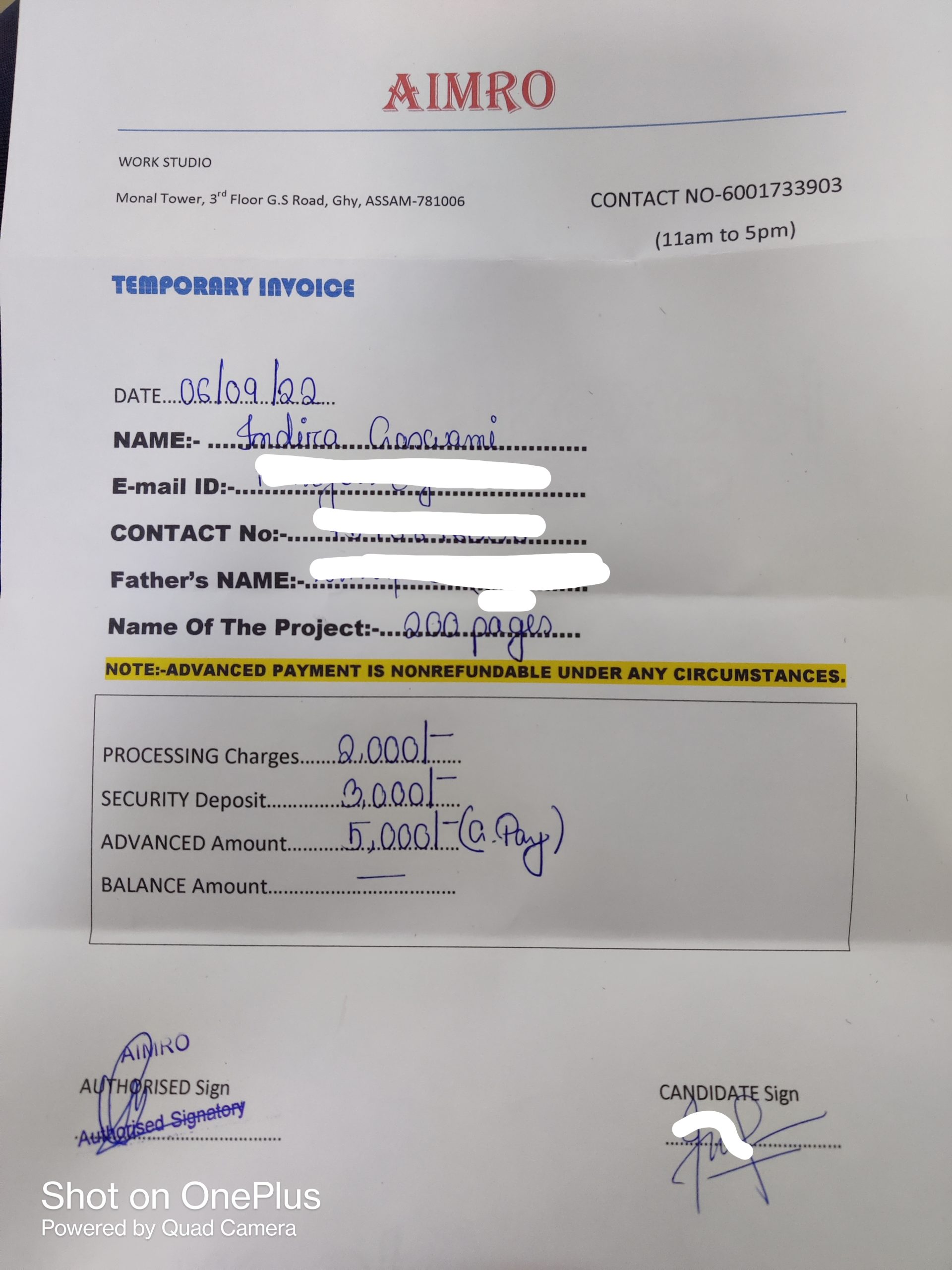 The incident happen when I received a call from AIMRO INFOTECH on 5th of September. Then I’ve received a text from HR-RAJ about the further details and the address of the office. The lady asked me to carry my Resume and pancard photo. After I went to the office the next day, the HR gave the details about the job that it has 3 different packages. The more salary package if chosen, the more processing fees plus security deposit is needed to pay. Therefore I chose the lowest package of Rs. 5000/- from which processing fee of Rs. 2000/- is non-refundable and the remaining fee of Rs. 3000/- is taken as security deposit that is said as refundable with the salary of Rs. 18,000/- every month plus Rs. 500/- per month till 6 months. And my job was to type from 200 jpeg images separately in a company software and needed to submit within 15 days. Then I paid Rs. 5000/- online through GPay to the Project Manager. After that they gave a receipt which I needed to click a photo and send in the WhatsApp of the Project Manager. After I sent the so-called receipt, I was asked to send my Adhaar card photo and then I received an agreement where it was written that the company expects 80% accuracy and accepts 20% mistakes. And it also said that the one who applies for the job and pay the money cannot get refund. The agreement was given to me after taking the money from me which clearly shows that its a scam. They should shown the agreement before taking the money from us. So to get rid of this job and get my money back I thought of doing it for atleast one month so that my deposited money gets recovered with my salary of said Rs. 18,000/-. I was then provided the project details. I was given some kind of work panel to submit the work within 15 days. The software they provided was very unsafe and detected malwares and viruses. The software was Winzip and from there I was asked to extract two apps NotepadPlus and Notebook. After downloading the software and installing it I opened and saw 200 jpeg images. And the images were so long that it is impossible to complete the given task in the span of 15 days. Then I searched about the company AIMRO Infotech and read its reviews which clearly shows that the company is a scam. Therefore, I decided to go back to the office and get my money back. But they denied to return my money back as it is against the company policy. I even told them to keep the processing fee of Rs. 2000/- and one month project fee of Rs. 500/- but they did not agree. They asked me to share 100 jpeg images to a friend to type (which is also against the company policy) and remaining 100 jpeg images for me to type in the span of 17 days. But no friend would help in such matters. Also they gave me an email- aimroinfotech111@yahoo.com and asked me to mail telling my issue. But I don’t know if it works or not. And now my money is stuck. I’ve no clue how to get my money back from these Fraudulent/Scam. Please help me out with this situation. And its a request to everyone, whoever is reading this please be careful from these scams of WFH (Work From Home).
