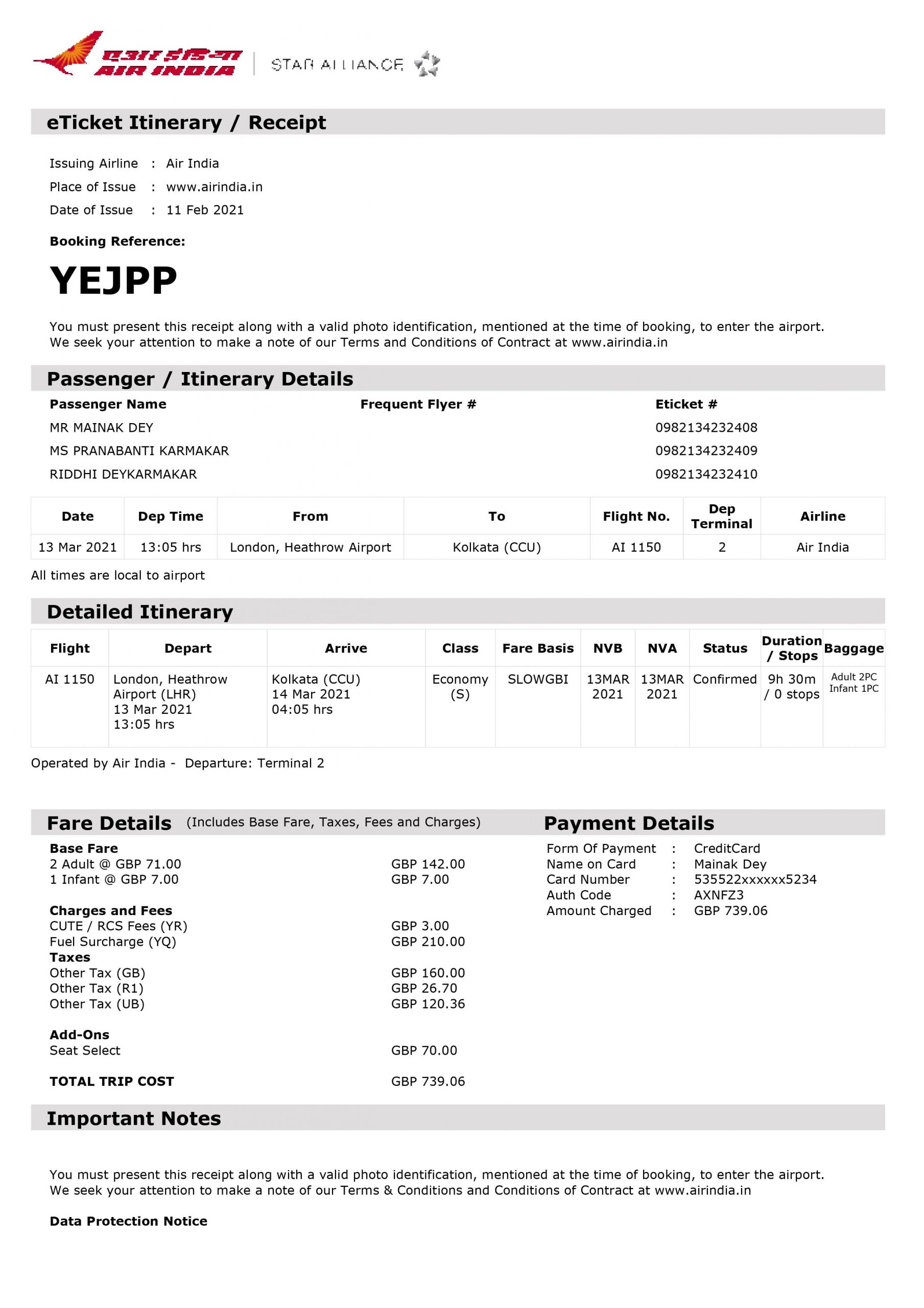 My name is Mainak dey, flight details are below and the ticket is attached Booking Ref: YEJPP London Heathrow(LHR) to Kolkata(CCU)