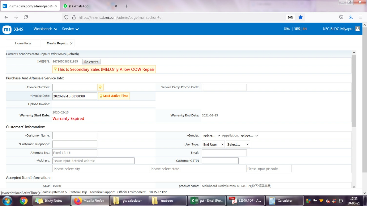 For your reference I have attached the 1) Purchase bill, 2) Mobile number IMEI number 3) Image from MI authorized service center which is showing Redmi note 4 pro 4) Image from MI authorized service center which is showing this is secondary sale mobile. 5) ) Image from MI authorized service center which is showing this mobile warranty was ended at 15-02-2021