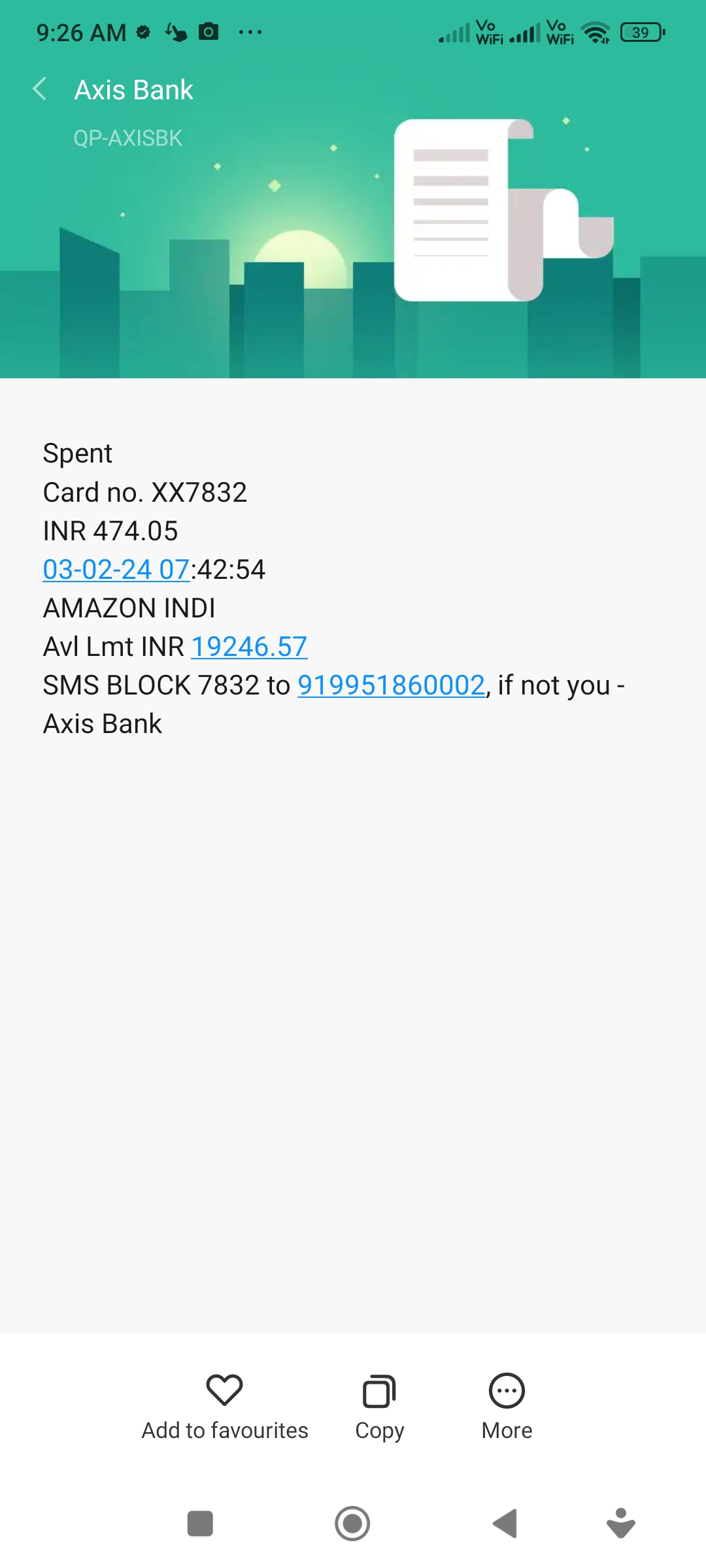 Today 3rd February, 2024 I suddenly saw a transaction from My Axis Bank credit Card of 474.05 against Amazon India CYBS SI 142463. I really dont know what is the transaction for.
