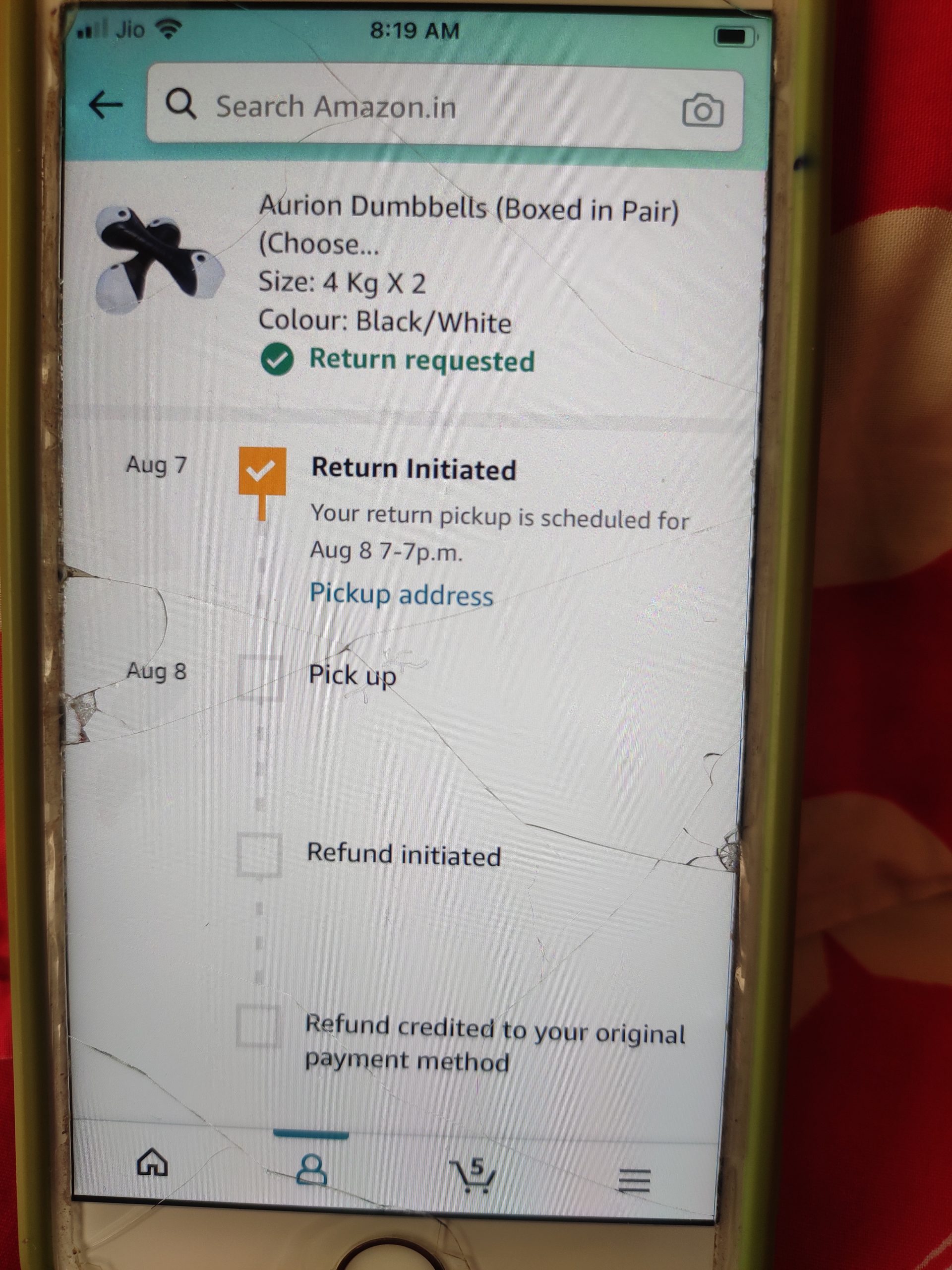 I have purchased a item (dumbbells) in first week of aug and they sent different color and I didn’t like product . I requested for return in next 2-3 days but after 35 days nonone came to pick up even no one available to answer calls from customer care , call is getting answered by computer and everytime informing me that it will be picked next day.