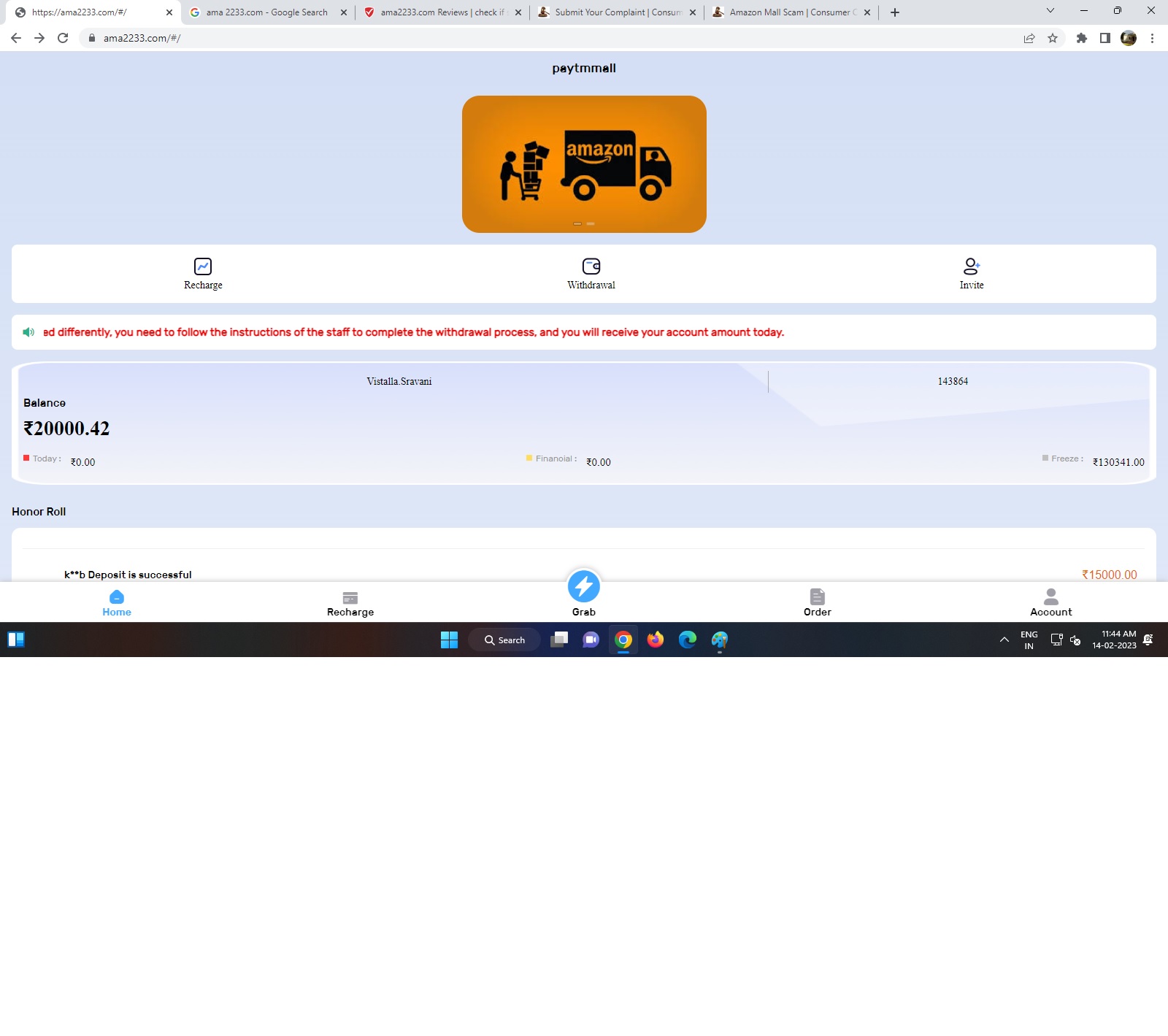 I have lost almost 90,000+ at “ama2233.com”. I found ad on Facebook to earn money online as a part time job. They convinced me to pay 200 for task and give tutorial through telegram to learn.. then she asked for next 1000 to earn 600. I received commission in both transactions but they’ve asked for another task where my last 6th Transaction failed due to they’ve asked to pay difference which is more than 1 Lakh. All my money frozen by them and they’re not replying now. Please help me to get my money back.