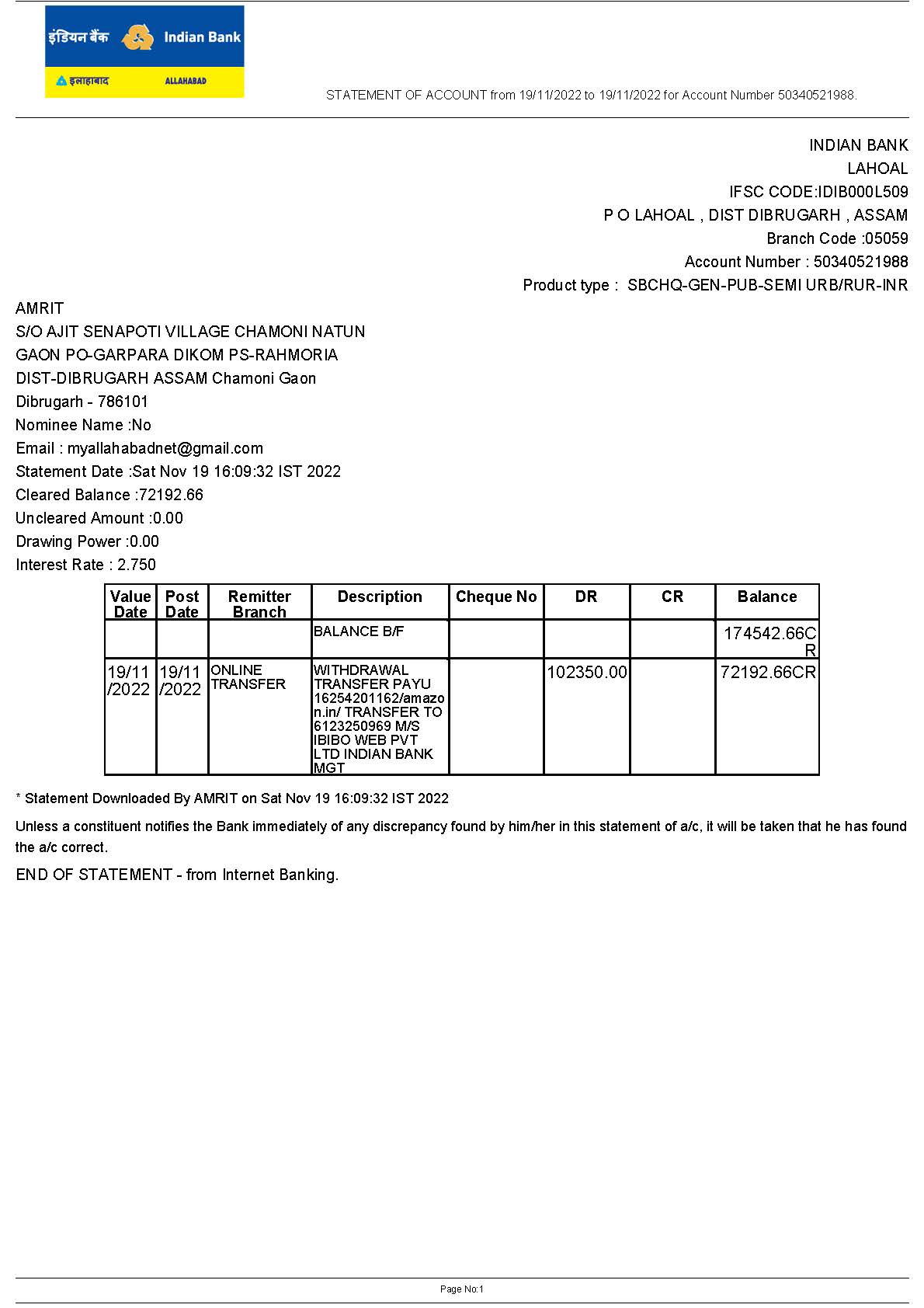 ref- 16254201162 /TRANSFER TO 6123250969 M/S IBIBO WEB PVT LTD