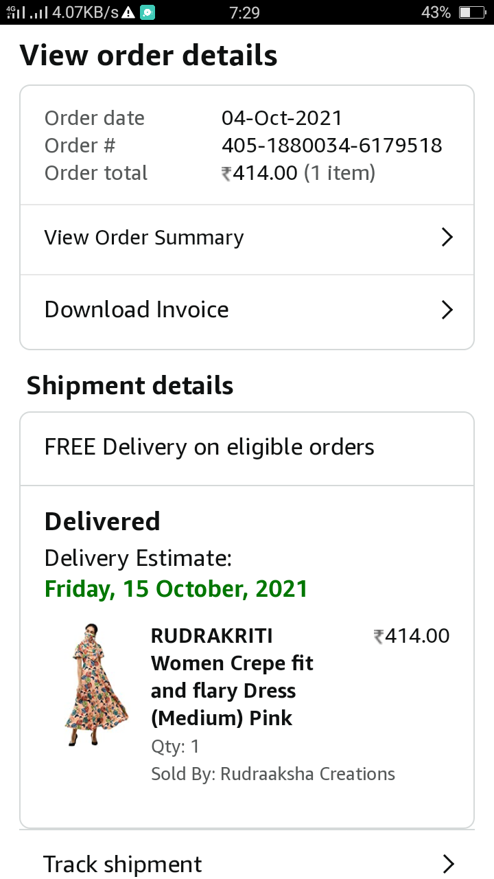 I have ordered a light pink or peach colour dress on 4th oct and got it on 15th but totally diffrent product black in colour size shape diffrent also brand name also diffrent free mask is missing so i have returnd it