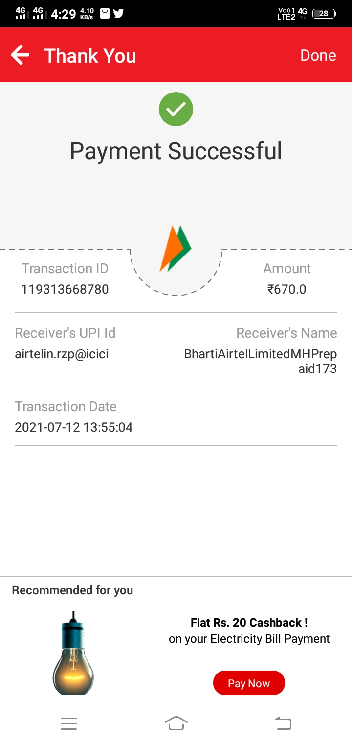 - I have done a transaction via Airtel Thanks UPI on 12th July 2021 of Rs.670 for airtel prepaid recharge. (Time – 01.55 PM) The amount has been debited and transaction is showing complete. But that recharge has not been done. Requesting you to look into the issue and help me to get my money back.