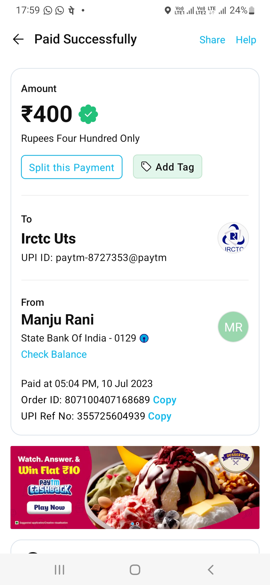 I was try to recharge 400 rs in wallet. But amount deducted and not credited in wallet. Upi transaction attached
