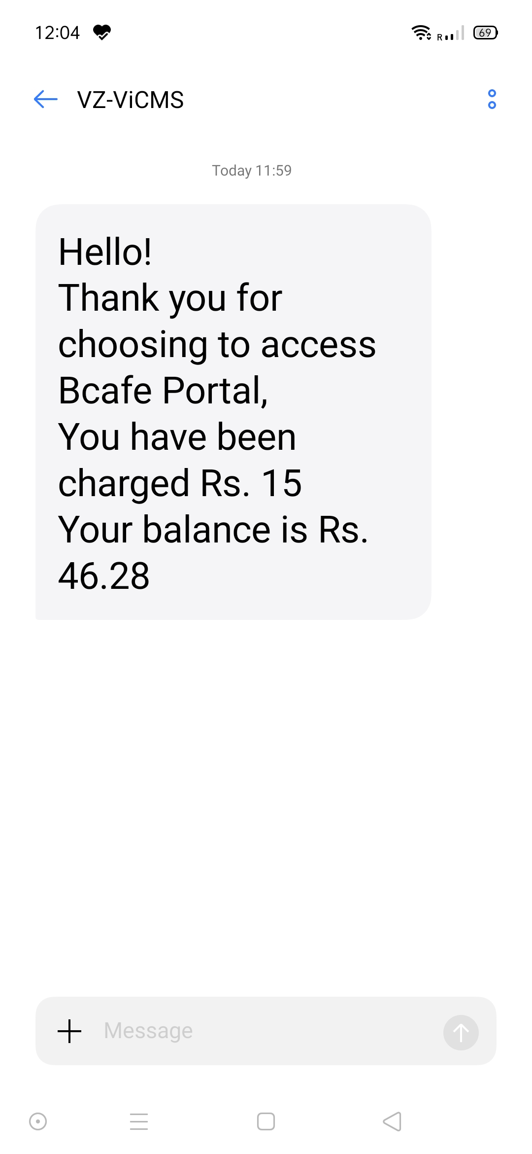 Today by 12:02 pm I got a message from VZ-ViCMS that rupees 15 has been deducted from my account in the name of bcafe.