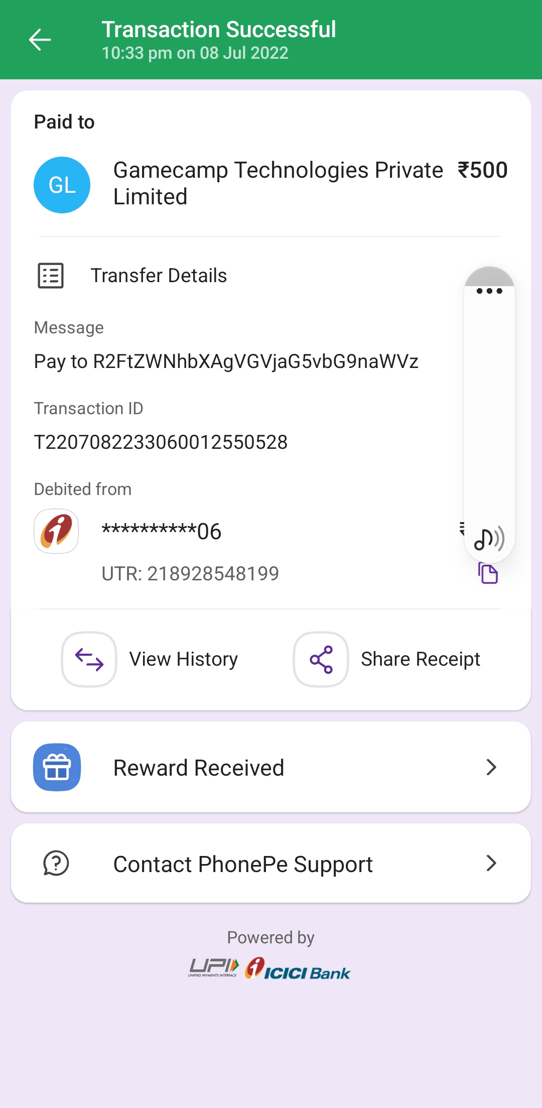Iam deposited 500/- inr bharat option trading site amount deducted my account via upi but amount is not credited in my bharat option wallet bharat option customer care is not responding any Mail or chat amount is credited bharat option given company name GAMECAMP TECHNOLOGIES PVT LIMITED COMPANY THIS COMPANY AND BHARAT OPTION SITE IS DOING FRUAD FOR COUSTMERS .