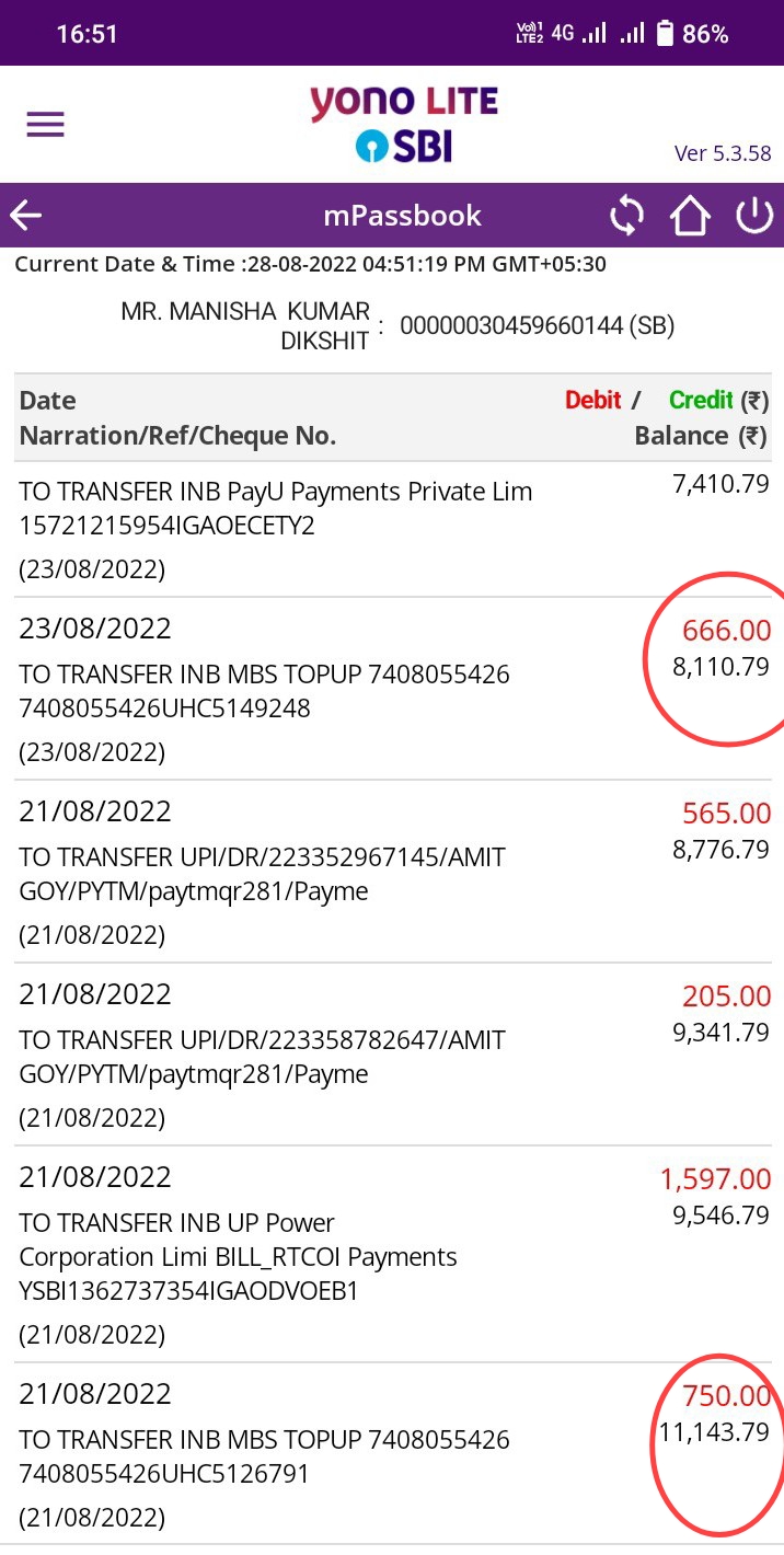 2. I again recharge mobile on 23 Aug 2022 for Rs 666/- amount debited mobile not recharged (UHC5149248).