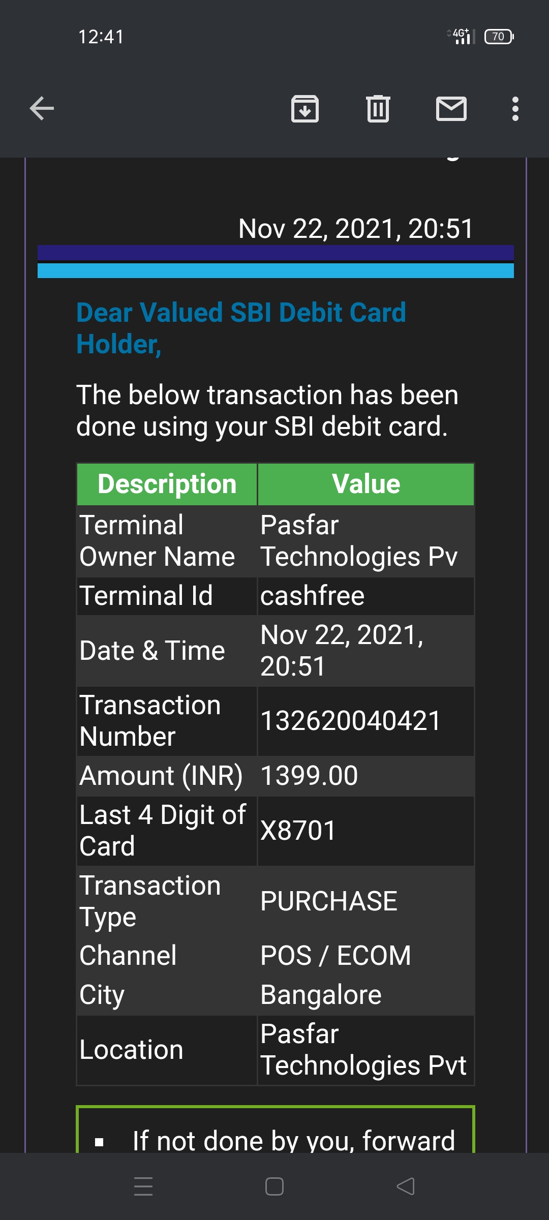 I have not done any transaction to Pasfar Technologies Private Limited from by bank account. But Rs. 1399 has debited from my bank account on dated 22/11/2021. I have received a text message on dated 23/11/2021 mentioning that my SBI YONO will be deactivated