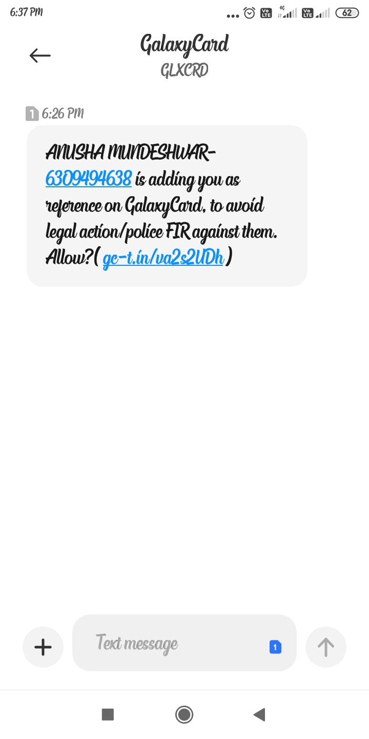 Today i.e 04/01/2022 i received an SMS as ANUSHA MUNDESHWAR-6309494638 is adding you as reference on GalaxyCard, to avoid legal action/police FIR against them. Allow?( gc-t.in/va2s2UDh ).