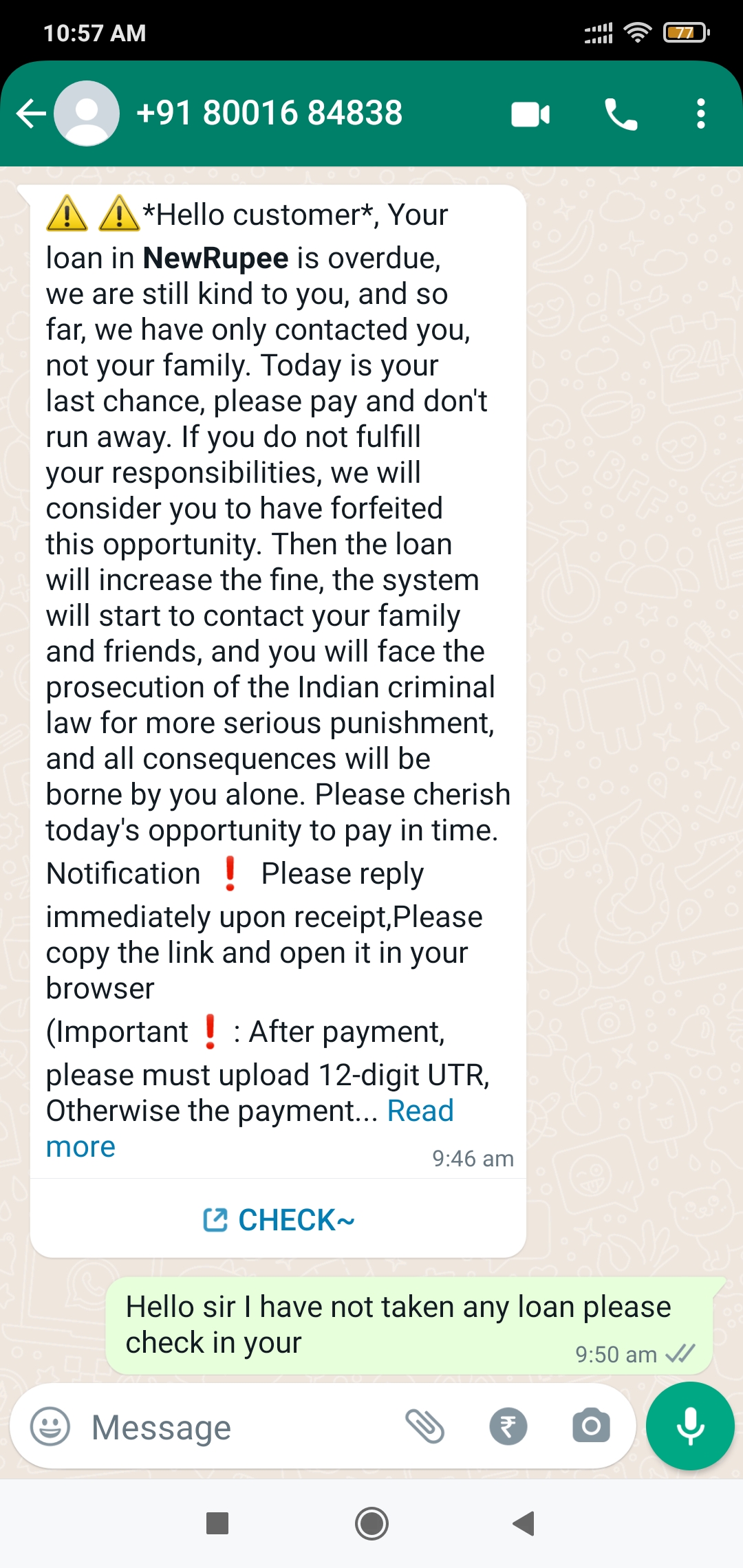 I am receiving fraudulent message on my WhatsApp from unknown persons asking me to repayment loans which i have never taken at all. They are threatening to contact my family and friends and i requests you to take strict action against such fraudsters.