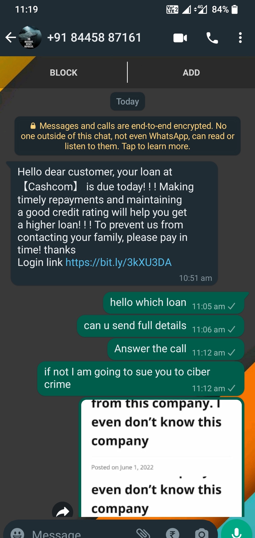 I received a MSG from number+91 84458 87161 in WhatsApp asking to make loan payment when I didn’t apply any loan