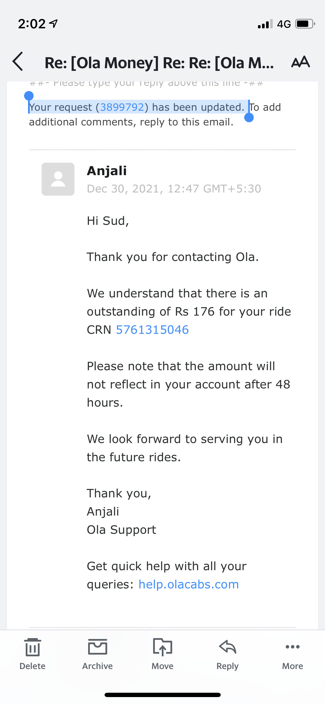 I used OLA cab after completion of my ride I paid fair via GPay but same amount deducted from my postpaid Ola account. I raised a complaint through app as well as on mail. I got reply on mail on 30th Dec21 as “your amount will cleared after 48 hours” till date the issue is not get resolved. I send multiple follow up mails but still issue is open. I’m getting daily twice or text and WhatsApp messages( from different mob no) to clear a due of postpaid account which are really irritating and disturbing me.