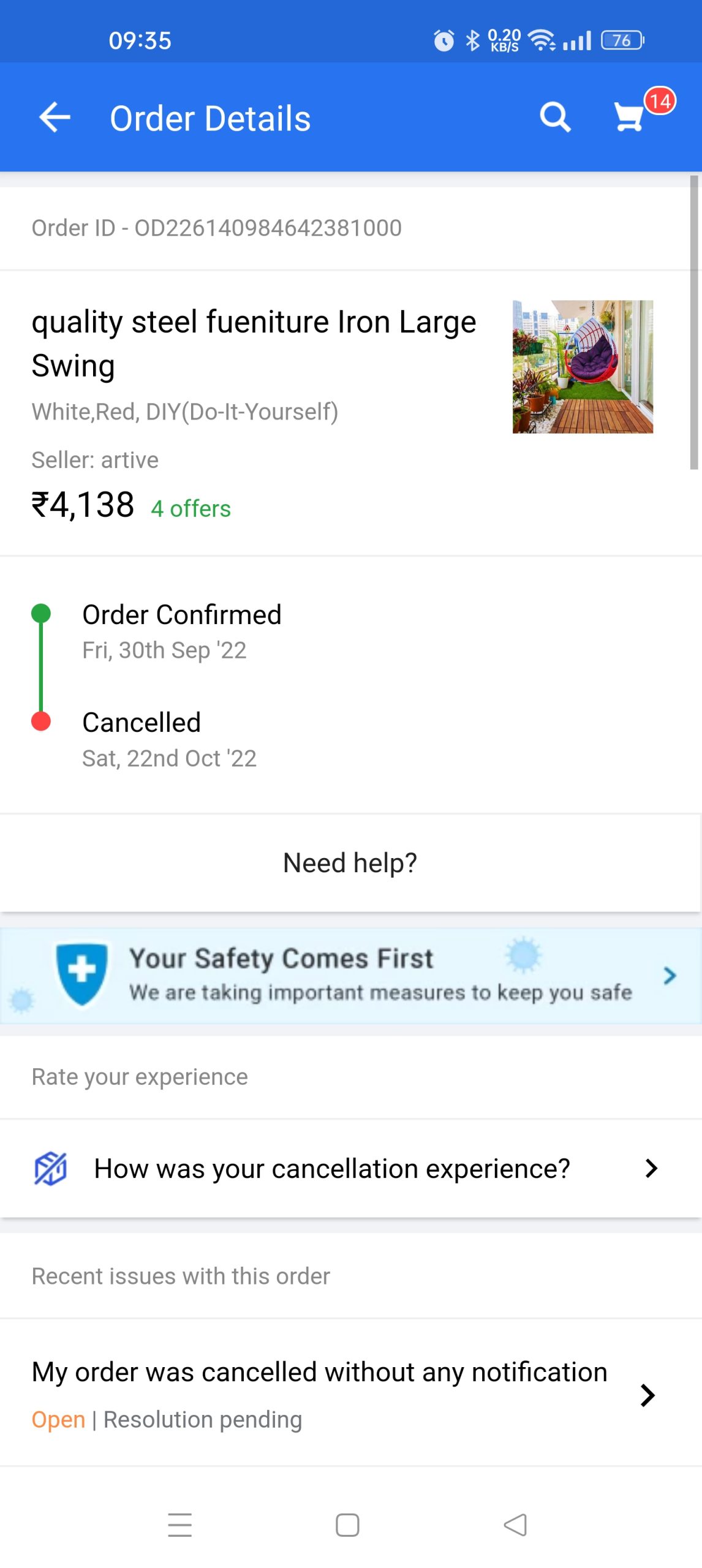 I have ordered one large swing from Flipkart during big billion days. This item was supposed to reach by 13/10/22. It was reached a hub near to me by 8th itself, but they never come to deliver the item. I have raised a complaint in flipkart and they told it will be resolved with in 18th. But they never allotted a delivery guy and on 18th they told they will resolve it in 22nd. Again they did nothing and send a message that they will resolve it in 26th. I have called flipkart almost everyday. I have even raised an issue in Delhivery’s site, who was their delivery partner. But none of them helped and one fine morning flipkart has cancelled the item without prior notice and updated in app that I have cancelled it. I have called them several times but they didn’t responded in proper way. They have only a sorry to say. This is awkward. I never expected this from Flipkart. If I had ordered a new item it could have get it delivered by now.