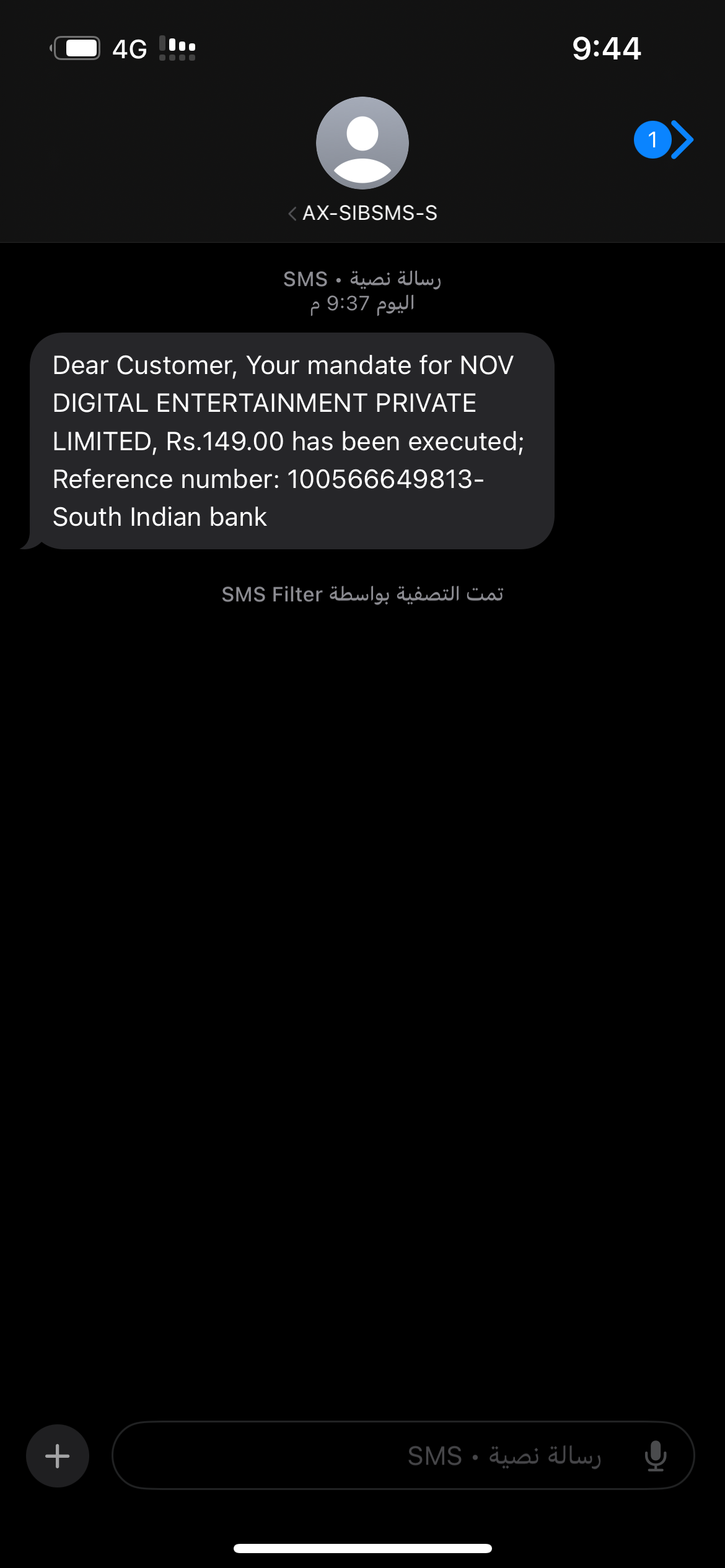 Dear Customer, Your mandate for NOV DIGITAL ENTERTAINMENT PRIVATE LIMITED, Rs.149.00 has been executed; Reference number: 100566649813- South Indian bank