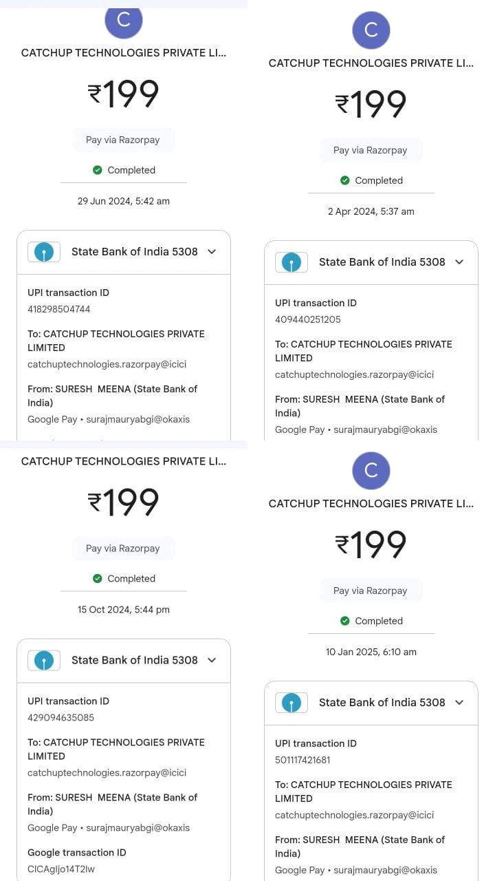 Catchup tecnology private limited कंपनी से पिछले कही 1-2 साल से मेरे खाते से 199राशि कट रही है कृपया मुझे मेरी धनराशि वापस दिलाने का कष्ट करे