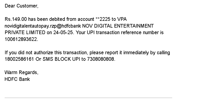An amount of Rs.149 got debited from my account on 02-Oct-2024 claiming that it is autopay, from my UPI account. It says UPI-NOV DIGITAL ENTERTAI- novidigitalentoutopay.rzp@hdfcbank. I did not activate any autopay from this account. It is a scam.