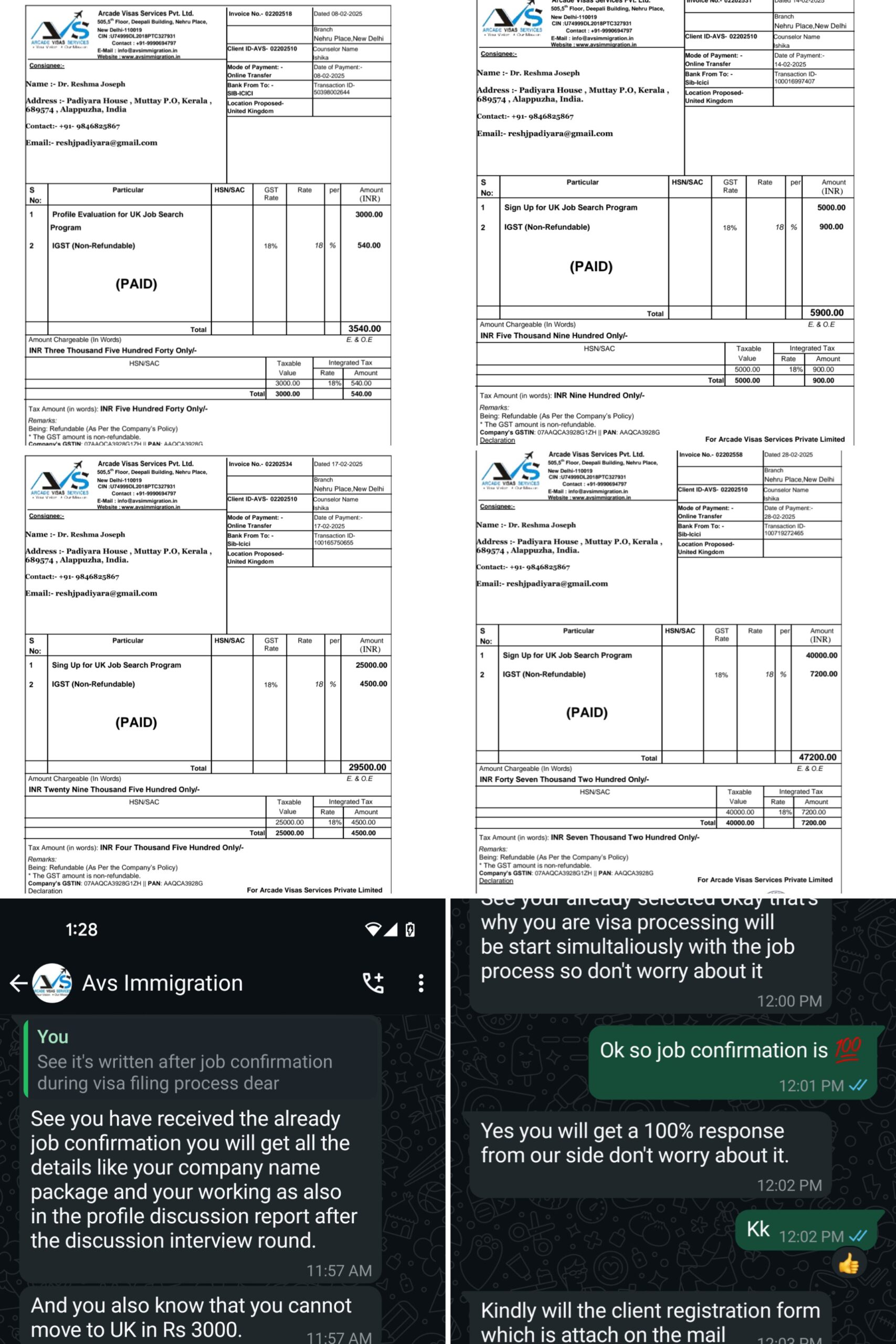 I am writing to file complaint against AVS immigration located in New Delhi for their fraudulent activities.On 8/2/25 i paid 3540 and later Rs 5900,29500,47200 on 14/2/25,17/2/25 and 28/2/25.However after taking money they failed to provide the service they promised.They told they will find job in UK and get me visa within 4 months since they have tie ups in UK.After payment they hired a case lawyer for me who was least bothered to do the processing and giving updates.He conducted a fraudulent interview.After that there is no response from their side and when I am texting or calling none of them is responding.