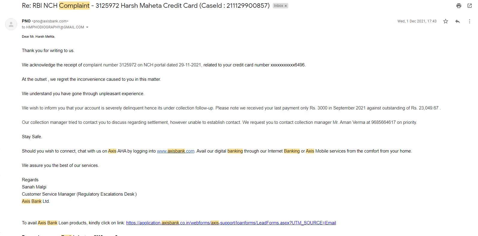 Axis bank Credit Card 5334 6700 0608 6496 – Overdue of 30K as due to jobless condition not in able to pay the bill in full one time slot so its request to provide me some partial time limit of 10 days so that i could clear my due