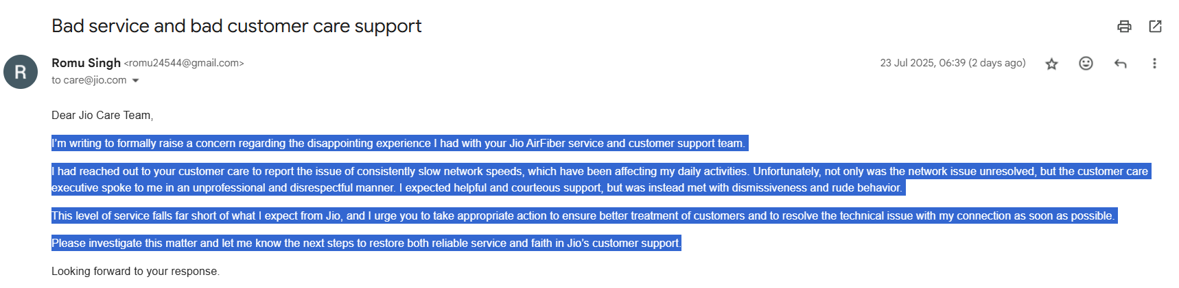 I’m writing to formally raise a concern regarding the disappointing experience I had with your Jio AirFiber service and customer support team.