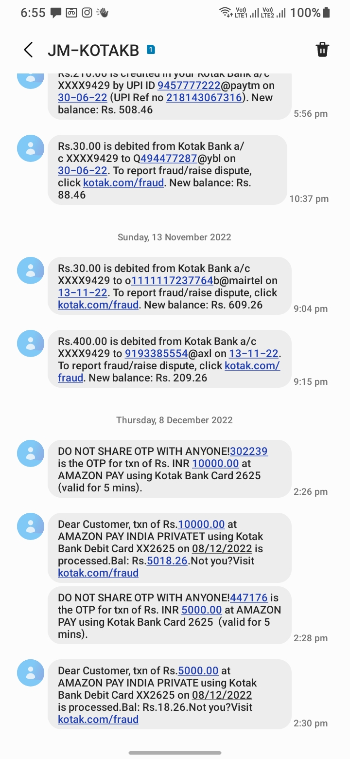 I find an otp on my gmail of transaction 10000 and one more transaction 5000 that otp sends to the fraudster with my permission and without any information and that transactions doing with my debit card