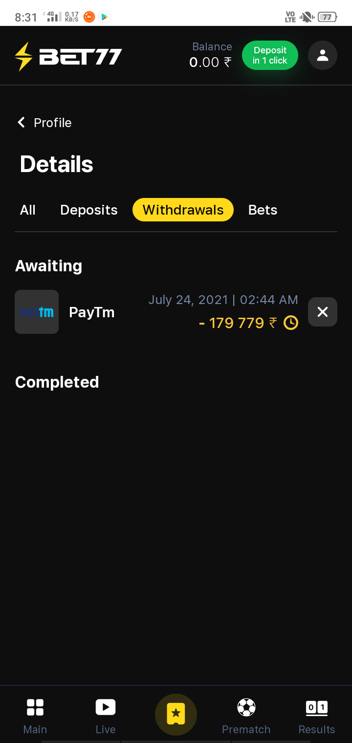 I have 179766 rupees in my wallet of bet77 and when I try to withdrawal my money it shows request pending and not giving money. I want my aal money in my paytm