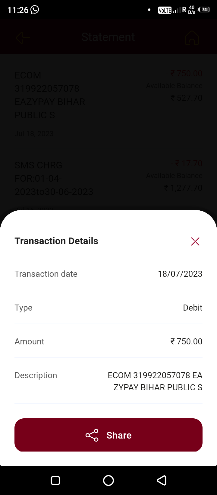 MONEY DEBITED FROM THE BANK BY PNB RUPAY DEBITE CARD Rs. 750