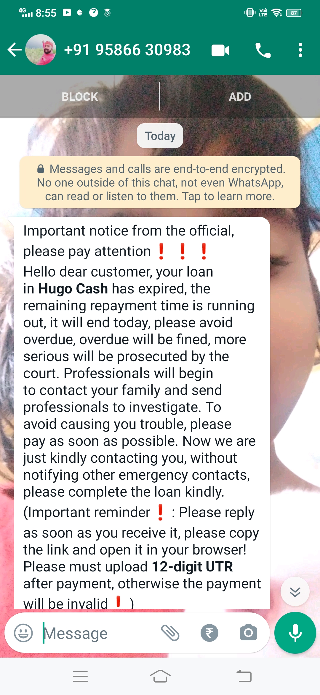 I have never applied for any loan from Hugo cash loan app.but today one message came in my WhatsApp.The message is following below.Important notice from the official, please pay attention❗❗❗