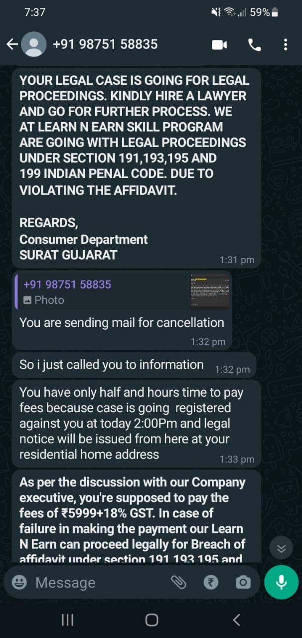 I am student now. They message to join to in their company. I ask is it 100% trustfull or not? Suddenly they send a pdf with government of India Authorization. Then they will a send a website and asked me to sign again am asked what is that 5999+GST they said it will be paid after your earning from learn n earn . But some problems to join so decided to cancel from learn n earn. But they blackmailing and threatening me to pay the fees otherwise they will filed the case on consumer court. It will become a big issue they said . I convinced more but they don’t accept it. After than i don’t give any response to them.after sometime they again told me pay and otherwise your case will be issued to your nearby police station . Learn n earn company have my aadhar card photo and email id . Please, help me receive or delete my details from learn n earn. And also help the people those who are cheated by learn n earn
