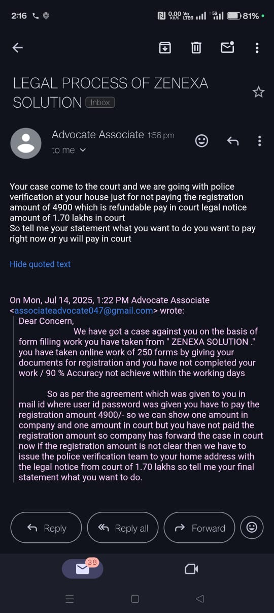 And now one advocate is mail me and blackmailing that he will take me in court & send the police at home.