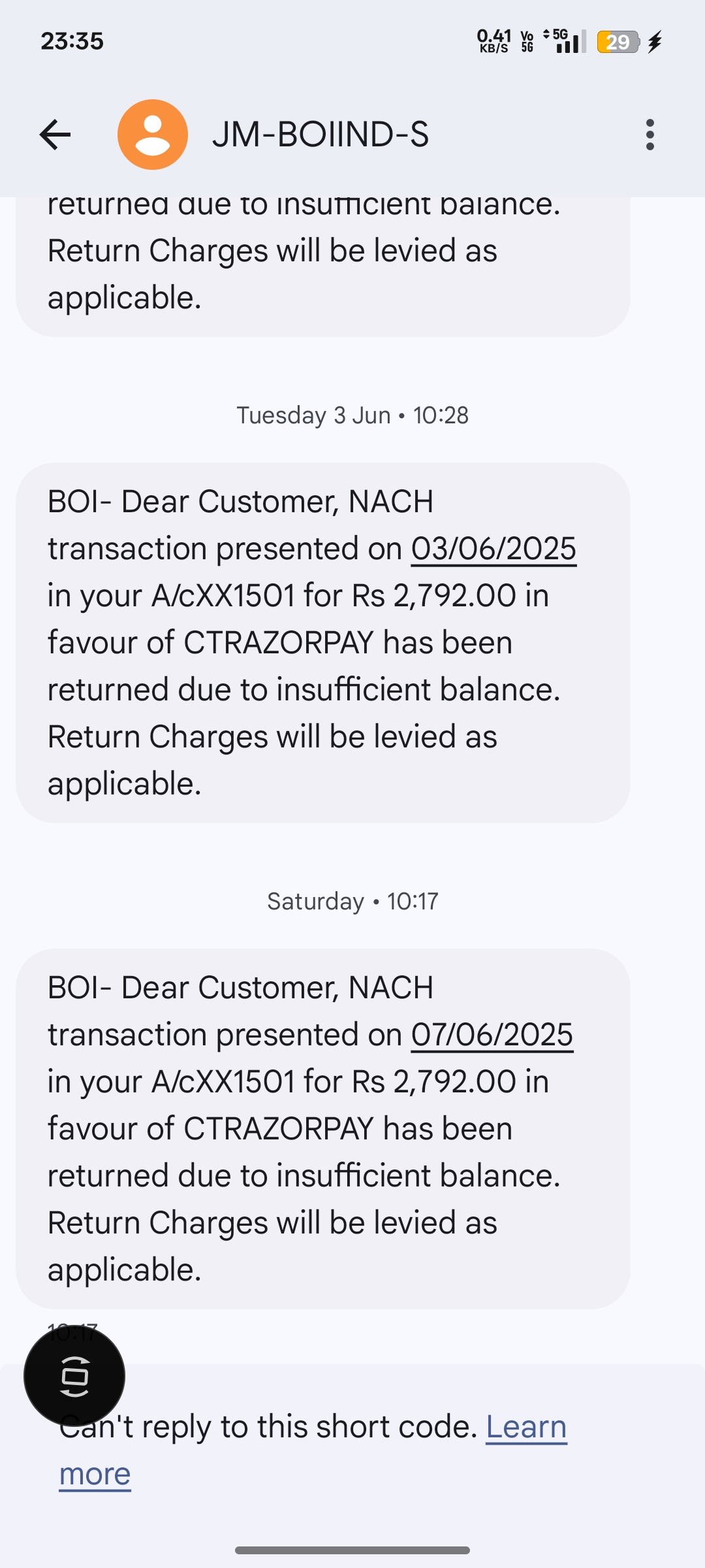 (BOI- Dear Customer, NACH transaction presented on 07/06/2025 in your A/cXX1501 for Rs 2,792.00 in favour of CTRAZORPAY has been returned due to insufficient balance. Return Charges will be levied as applicable.)